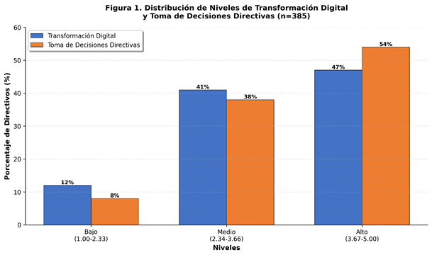 El gráfico 1 presenta un gráfico de barras comparativo que permite visualizar de manera clara la distribución porcentual de los directivos según los niveles de Transformación Digital y Toma de Decisiones Directivas, categorizados en tres rangos: Bajo (1.00-2.33), Medio (2.34-3.66) y Alto (3.67-5.00). Esta representación gráfica complementa los estadísticos descriptivos de la Tabla 2 y ofrece una perspectiva más intuitiva sobre el estado de ambas variables en la muestra estudiada.