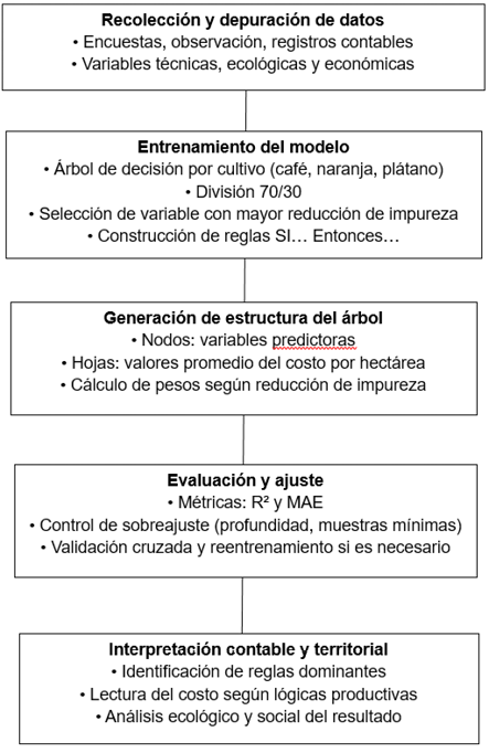 En este contexto, el ecosistema cafetero de Caicedonia ilustra cómo las diferencias de altitud, acceso a insumos y demanda de mano de obra generan estructuras de costo diversas entre cultivos como café, naranja y plátano. El costeo, por tanto, se entiende como una práctica social vinculada al conocimiento local y a la vida familiar más que como un simple registro financiero. El uso de árboles de decisión permite representar esta complejidad al identificar reglas de costeo sin depender de supuestos estadísticos rígidos, integrando variables técnicas, económicas y ecológicas (Casilimas et al., 2021; Trentin et al., 2024).