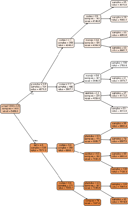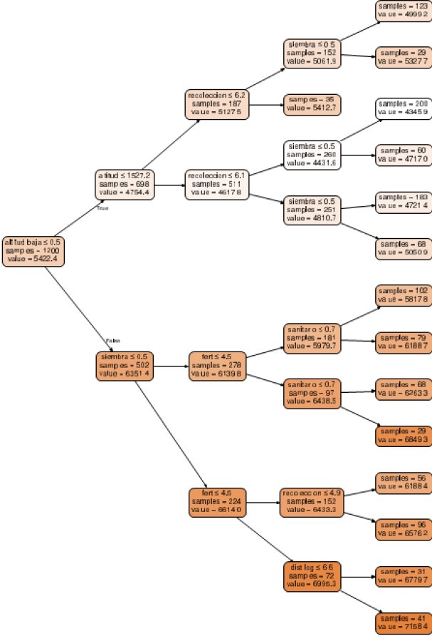 A partir de estas divisiones se construyen reglas jerárquicas del tipo si se cumple una condición entonces ocurre un resultado, de modo que las ramas representan trayectorias técnico-ecológicas y las hojas contienen el costo promedio estimado. Se entrenó un modelo por cultivo, usando el setenta por ciento de los datos para entrenamiento y el treinta por ciento para prueba, y el desempeño se evaluó mediante R² y el error absoluto medio.