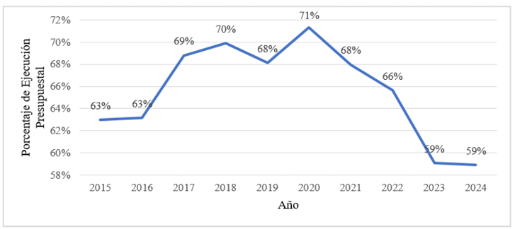 Con el fin de caracterizar el comportamiento de la ejecución presupuestal en el período analizado, el Gráfico 1 presenta la evolución del porcentaje promedio anual entre 2015 y 2024. La relativa estabilidad observada, con variaciones moderadas en el tiempo, respalda el uso de promedios como aproximación agregada para la construcción de los indicadores histórico y reciente.