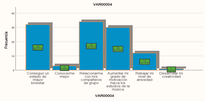 Al respecto, se encontró una conexión directa de un porcentaje recurrente que oscila entre un 10% a un 20% donde un 28,57%; 30,36%; 26,79% de estudiantes percibieron que consiguieron un mejor estado de bienestar, relacionarse con sus compañeros y aumentar su motivación hacia los estudios de música. Considerando lo anterior, Sánchez y Fernández-Company (2023) recalcan que el principal objetivo de la musicoterapia es mejorar la calidad de vida y promover el bienestar en personas de todas las edades y condiciones, incluidos aquellos que enfrentan desafíos emocionales, físicos o cognitivos, debido a que permite desarrollar una comunicación interpersonal o en comunidad de manera satisfactoria (Howe y Pérez-Eizaguirre, 2020).