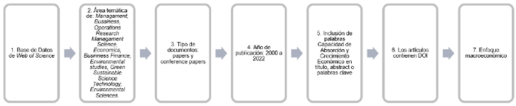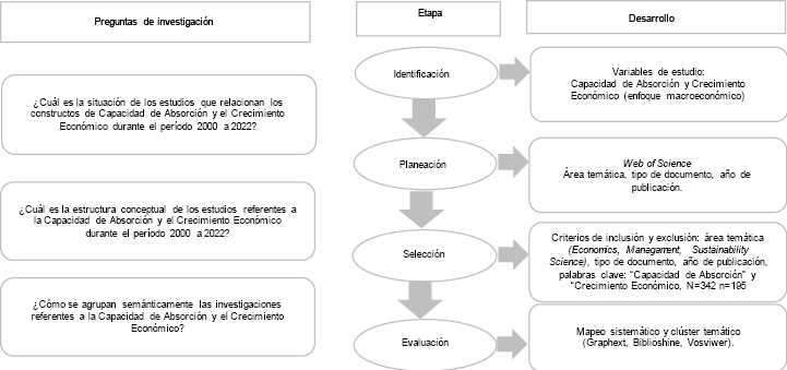 El estudio se integra en cuatro fases; en la primera, que es la identificación, se encontró que existen múltiples estudios a nivel empresarial y limitadas investigaciones con enfoque macroeconómico o país con los constructos de capacidad de absorción y crecimiento económico. En la fase de planeación, se seleccionó la base de datos de Web of Science como fuente de consulta líder en el área de estudio, que incluye el índice de ciencias sociales en economía y administración; los resultados arrojaron 342 artículos.