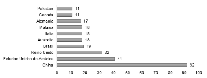 El gráfico 2 muestra la producción científica por país durante el período de 2000 a 2022. Los datos reflejan los diez países con mayor productividad. China es líder en la producción de conocimiento asociada a la temática de capacidad de absorción y crecimiento económico, superando en más del 50 % a Estados Unidos de América y Reino Unido, que se ubican en segundo y tercer lugar de producción.