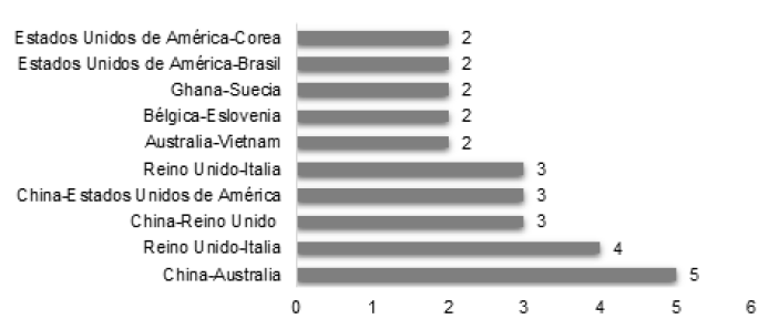 Referente a la producción científica generada de forma colaborativa entre países, China y Australia producen el mayor número de colaboraciones con cinco artículos, seguido del Reino Unido e Italia, China y el Reino Unido. Se refleja que China y Reino Unido lideran la producción científica colaborativa, como se observa en el gráfico 3.