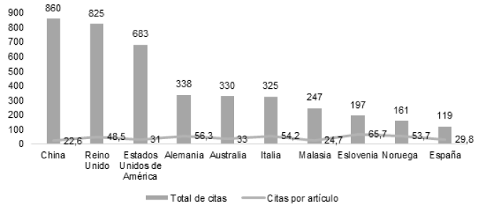Otro indicador es el número de citas. En el gráfico 4, se presentan los diez países con mayor número de citas. China lidera con 860 citas durante el período de 2000 a 2022; en segundo lugar, se ubica Reino Unido, seguido de Estados Unidos de América, los cuales reflejan más de 680 citas. En cuanto a las citas por artículo, en primer lugar, se ubica Eslovenia, seguido de Alemania e Italia, que superan el 50 %.
