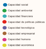 La ilustración 1, muestra la representación gráfica de las agrupaciones que arroja Graphext. Se visualizan ocho clústeres que integran los artículos que abordan temáticas similares y se agrupan semánticamente, mostrando una agrupación multidimensional mediante el análisis de texto, a partir del criterio de análisis de título del artículo, palabras clave y resumen. De acuerdo con las agrupaciones semánticas, para el presente estudio se denominan capacidad tecnológica, capacidad financiera, capacidad humana, capacidad de políticas públicas, capacidad social, capacidad empresarial, capacidad económica y capacidad ambiental.
