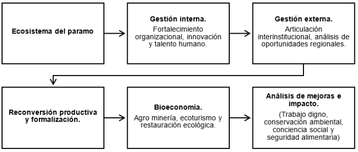 Cada componente articula dimensiones clave del desarrollo. En primer lugar, se encuentra el ecosistema de páramo, que constituye el punto de partida y el recurso esencial a proteger. El segundo eje corresponde a la gestión interna, en la que desempeñan un papel central el fortalecimiento organizacional, la innovación y el desarrollo del talento humano. El tercer eje es la gestión externa, orientada a la articulación institucional y al aprovechamiento de oportunidades regionales. El cuarto componente aborda la reconversión productiva y la formalización, como vía para transitar hacia actividades sostenibles. A este se suma la incorporación de la bioeconomía, con énfasis en agrominería, ecoturismo y restauración ecológica. Finalmente, el modelo contempla el análisis de mejoras y la medición del impacto esperado en términos de trabajo digno, conservación ambiental y seguridad alimentaria.