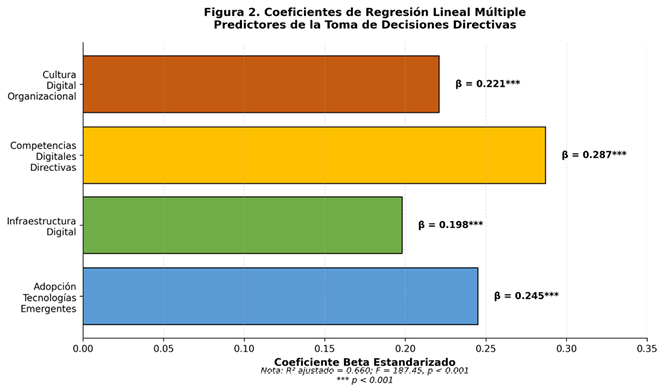El modelo de regresión identifica a las Competencias Digitales Directivas (β=0.287) como el predictor más fuerte de la toma de decisiones, seguido por la Adopción de Tecnologías Emergentes (β=0.245), la Cultura Digital Organizacional (β=0.221) y la Infraestructura Digital (β=0.198), todos estadísticamente significativos (p<0.001). En conjunto, estas cuatro dimensiones explican el 66% de la variabilidad en la toma de decisiones directivas (R²=0.660), lo que subraya que el factor humano (competencias y cultura) tiene mayor peso que los factores tecnológicos, ofreciendo una guía clara para la priorización de inversiones institucionales.